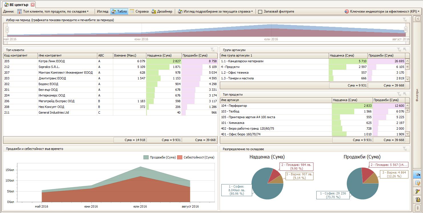 С инсталирането на версия 2016.4 към всяка фирма ще бъдат добавени 9 вида предварително подготвени от нас табла за бизнес анализи в областта на топ клиенти, топ продукти, продажби и печалби, вземания и задължения, наличности и дни до изчерпването им, парични средства, дълготрайни активи,счетоводни приходи, разходи и печалби, разходни центрове и други.