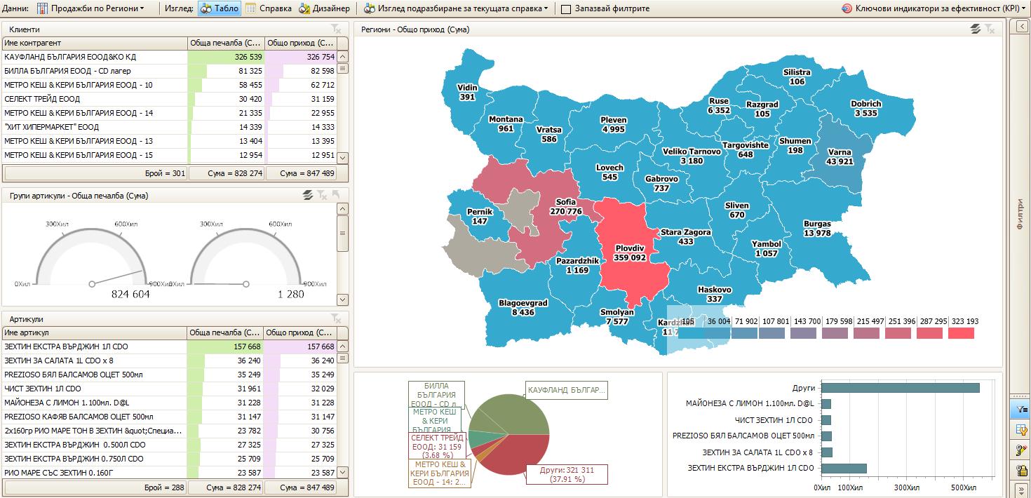 Данните в таблата са интерактивни, което означава, че при кликването на даден елемент (например даден клиент), всички останали данни в таблото (други данни като артикули или складове, всички видове графики, общи суми и други) автоматично се филтрират спрямо избрания от потребителя елемент.