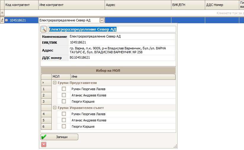 В долната половина на справката са подредени имената на представителните лица. Ако на съответния ред в полето „МОЛ“ сложите отметка, съответното, то съответното име ще бъде записано като МОЛ за контрагента при кликване на бутона „Запиши“. Първото име в списъка ще се запише като основно МОЛ, а останалите – като допълнителни. Поредността на имената може да се променя чрез влачене с мишката.
