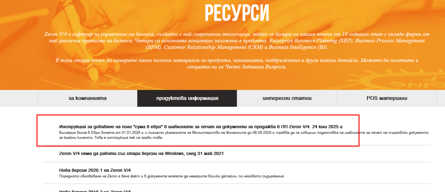 По-късно през годината ще Ви изпратим и информация за това как ще се извърши и конвертирането на базите данни в Zeron за работа с локална валута Евро.