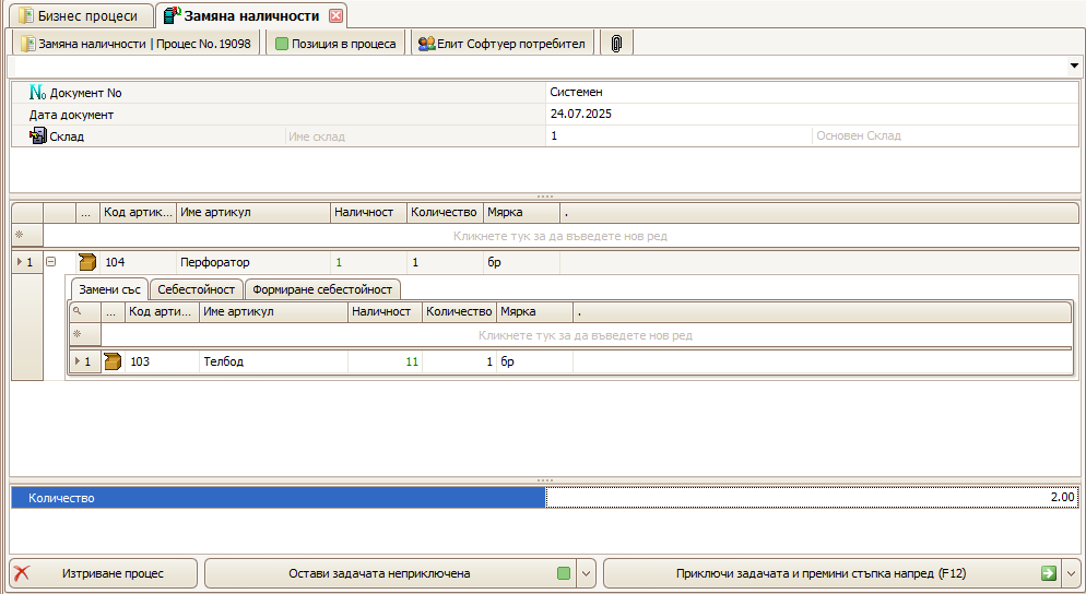 2. Нова задача „Замяна наличности“ в бизнес процесите.