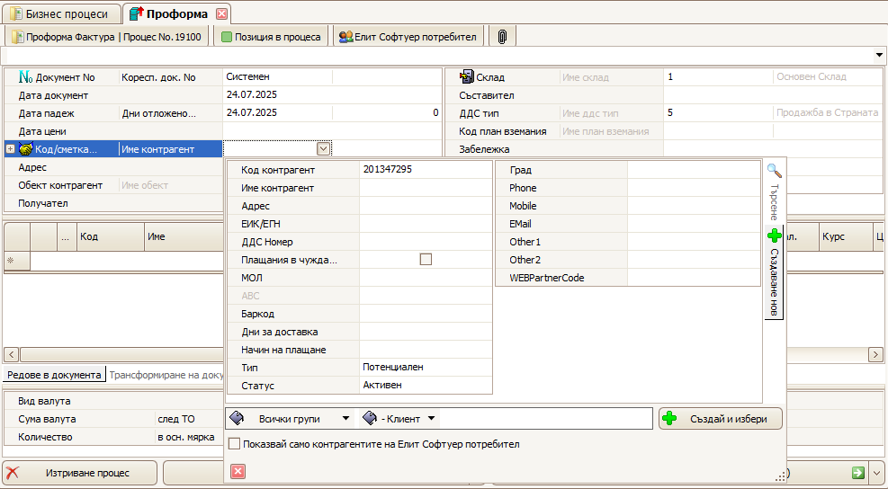 Новият контрагент ще се създаде в избраната група в търсачката (задължително трябва да сте избрали група). След като сте въвели данните, кликнете на бутон „Създай и избери“, контрагентът ще бъде създаден, а кодът му избран в документа. На същия принцип е добавена и възможност за създаване на нови артикули от Търсене на артикули.